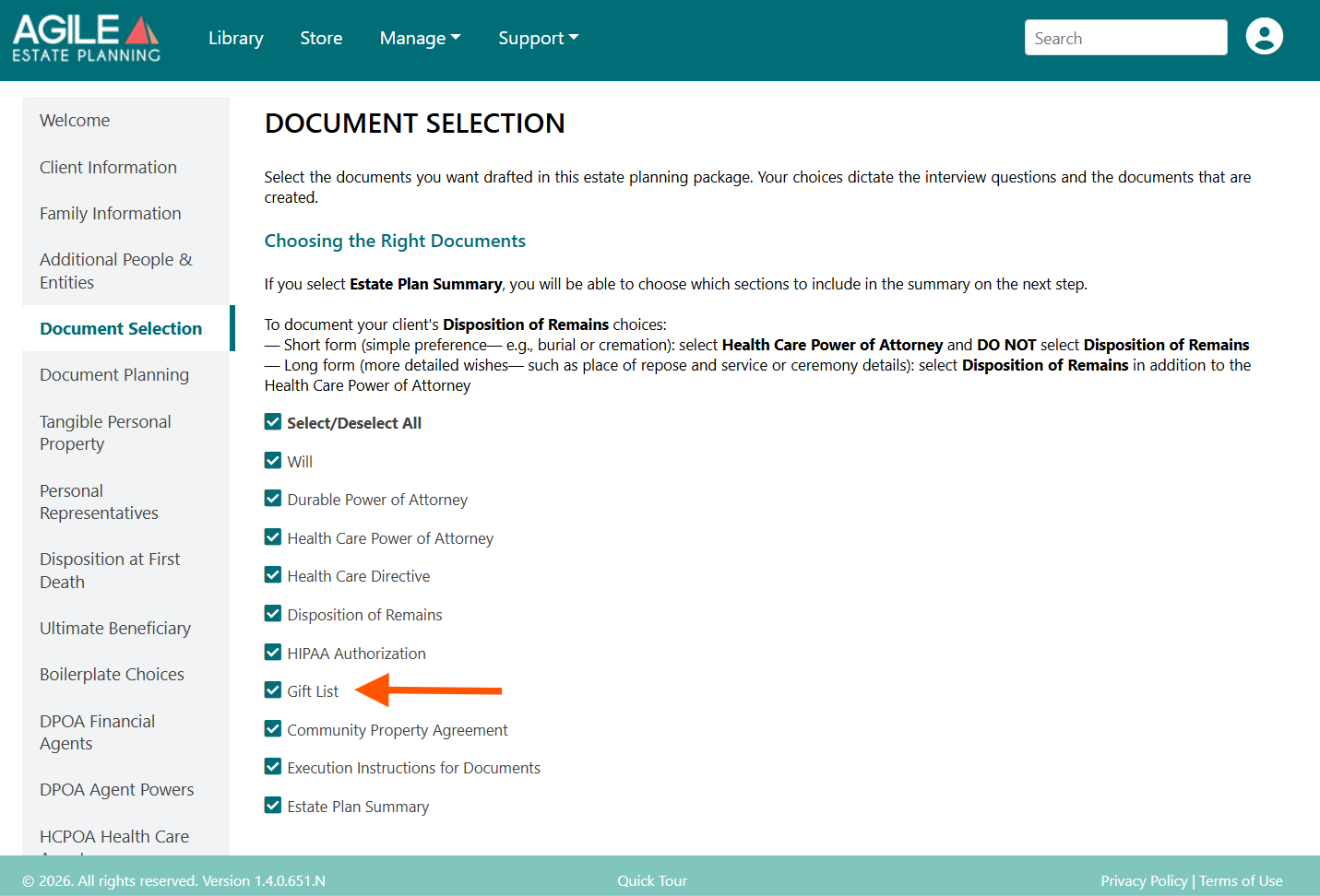 Selecting Gift List adds a Personal Property Memorandum to the plan. Deselecting Gift List means tangible personal property will be governed solely by dispositive provisions in the Will or Trust.