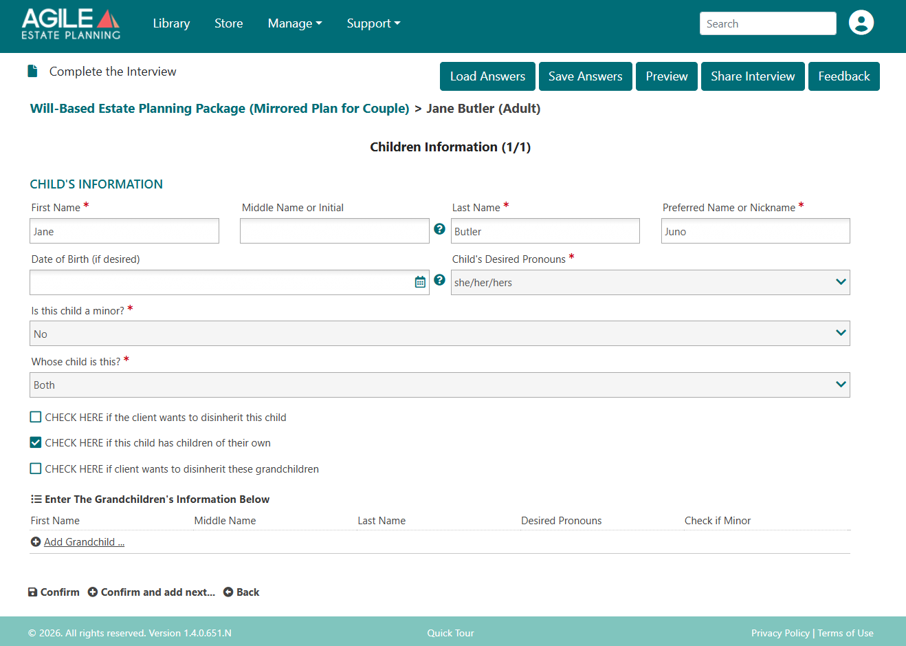 Entering grandchildren ensures they are available for selection in the distribution, trust, or fiduciary sections of the drafting interview if needed.