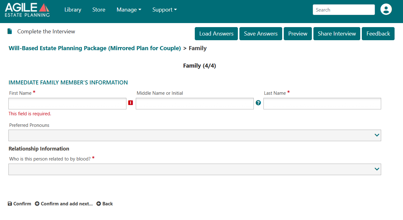 Information entered here drives descendant definitions, contingent distribution schemes, guardianship provisions, and certain default provisions across the document package. Listing a family member does not create a gift. Dispositive decisions are made later in the drafting process. This tab establishes structure, not final allocation.