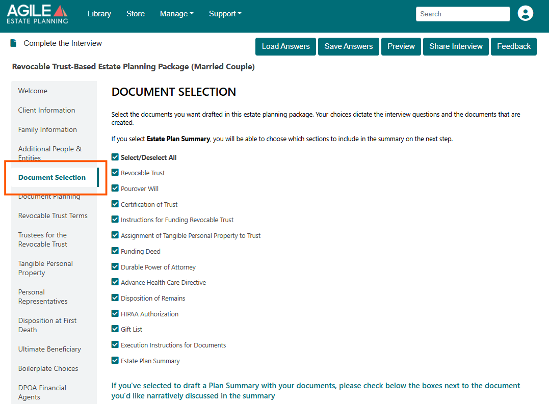 You explicitly choose which estate planning documents are included in the package for this client or clients.Interview Customization